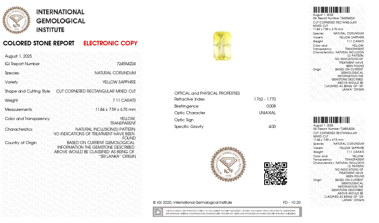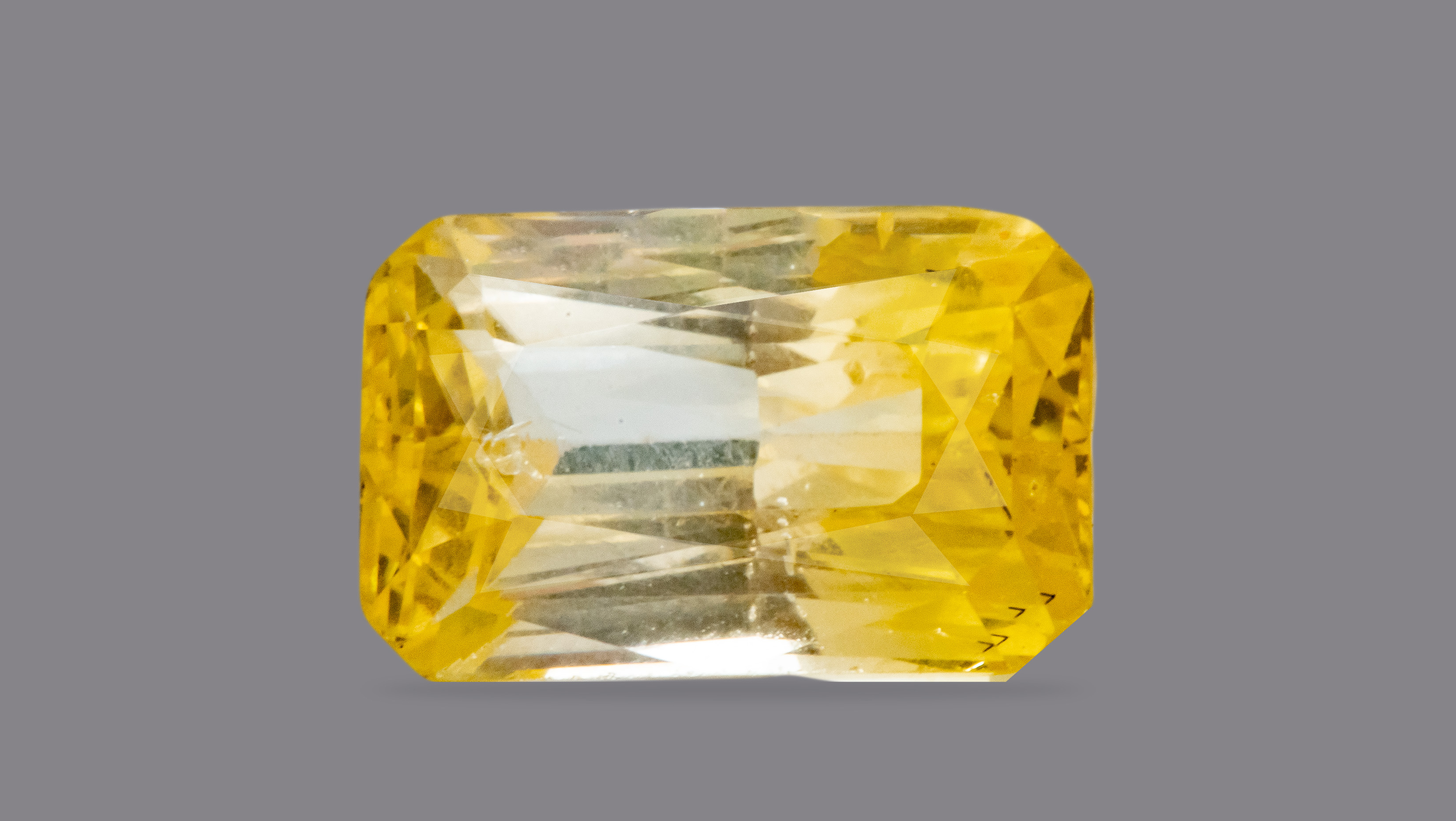 Buy one beautiful transparent 7.11 Carat/ 7.81 Ratti original yellow sapphire stone online . It has a Rectangular cut shape, and a clarity grade of eye clean (evaluated at eye level), with good color intensity. The origin of this real yellow sapphire(pukhraj) stone is Ceylon(Sri Lanka). This yellow sapphires is 100% unheated & untreated and certified from IGI Govt. Lab.