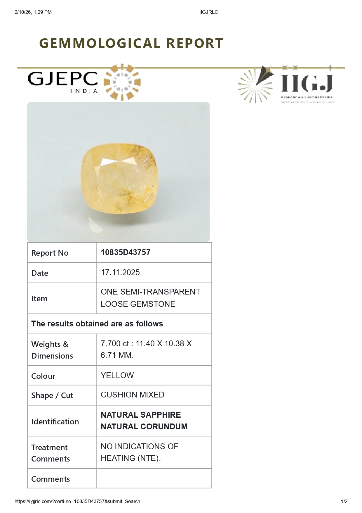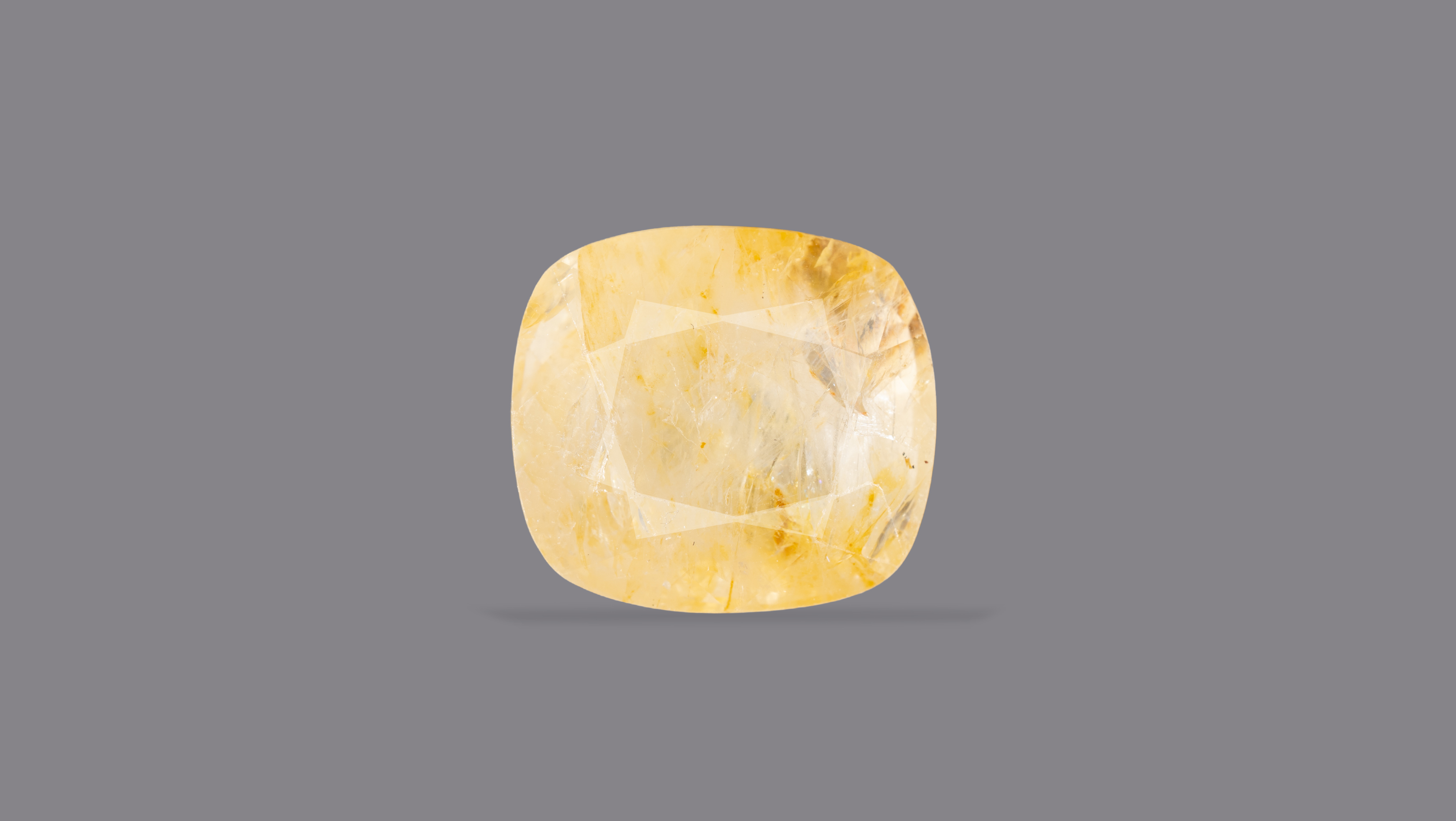 Buy one beautiful transparent 7.70 Carat/ 8.46 Ratti original yellow sapphire stone online.It has a cushion shape, and a clarity grade of eye clean (evaluated at eye level), with good color intensity. The origin of this real yellow sapphire(pukhraj) stone is Ceylon(Sri Lanka). This yellow sapphires is 100% unheated & untreated and certified from IIGJ Govt. Lab.