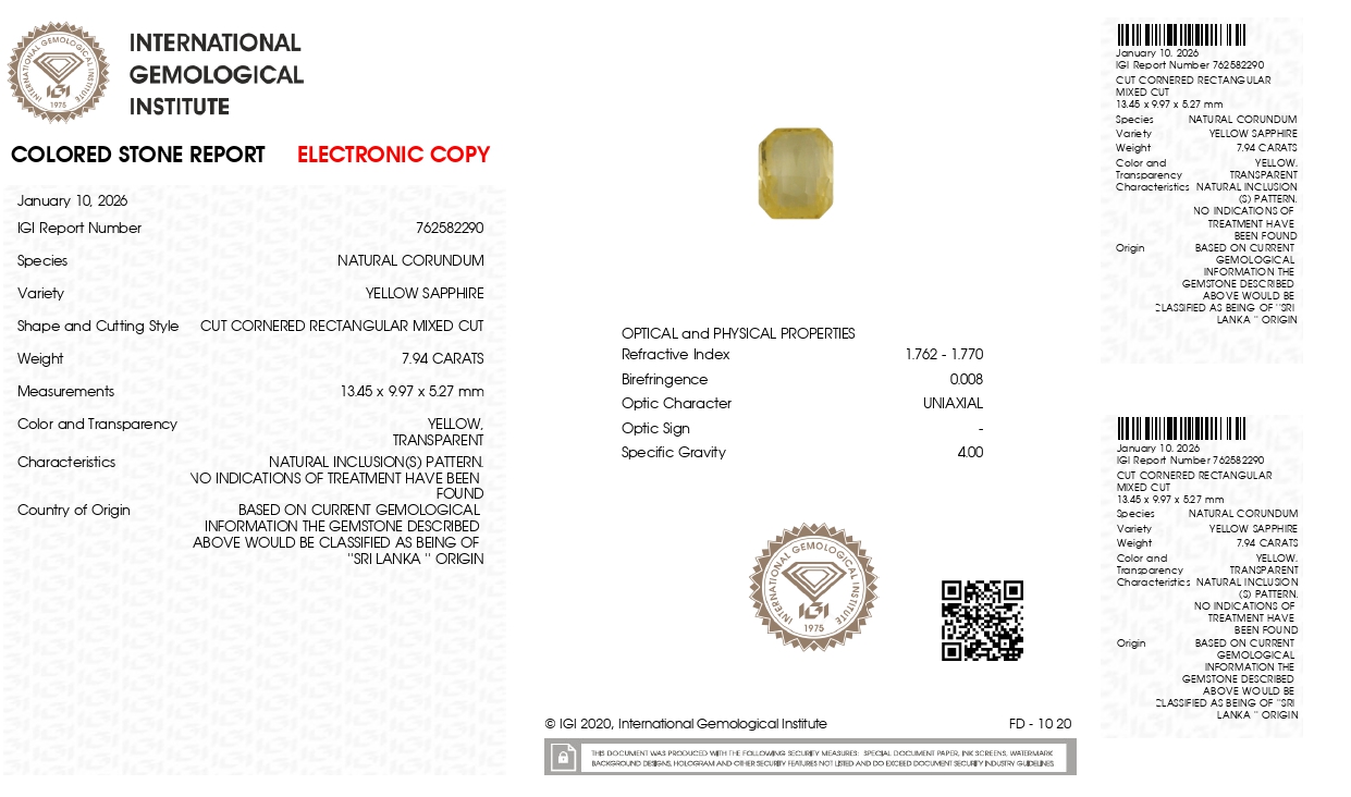 Buy one beautiful transparent 7.94 Carat/ 8.73 Ratti original yellow sapphire stone online.It has a Rectangular cut shape, and a clarity grade of eye clean (evaluated at eye level), with good color intensity. The origin of this real yellow sapphire(pukhraj) stone is Ceylon(Sri Lanka). This yellow sapphires is 100% unheated & untreated and certified from IGI Lab.