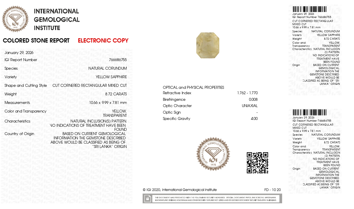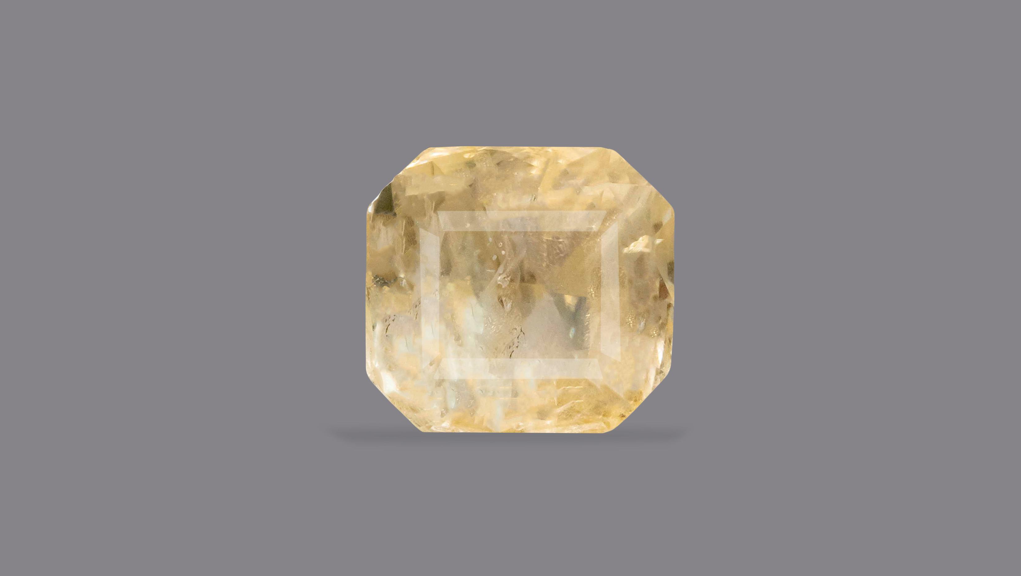 Buy one beautiful transparent 8.72 Carat/ 9.58 Ratti original yellow sapphire stone online.It has a Rectangular mixed cut shape, and a clarity grade of eye clean (evaluated at eye level), with good color intensity. The origin of this real yellow sapphire(pukhraj) stone is Ceylon(Sri Lanka). This yellow sapphires is 100% unheated & untreated and certified from IGI Lab.