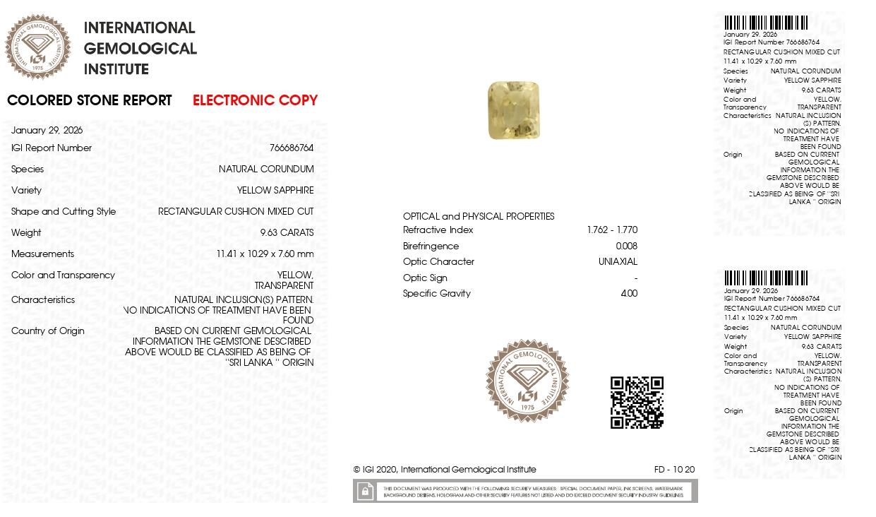 Buy one beautiful transparent 9.63 Carat/ 10.58 Ratti original yellow sapphire stone online.It has a Cushion shape, and a clarity grade of eye clean (evaluated at eye level), with good color intensity. The origin of this real yellow sapphire(pukhraj) stone is Ceylon(Sri Lanka). This yellow sapphires is 100% unheated & untreated and certified from IGI Lab.
