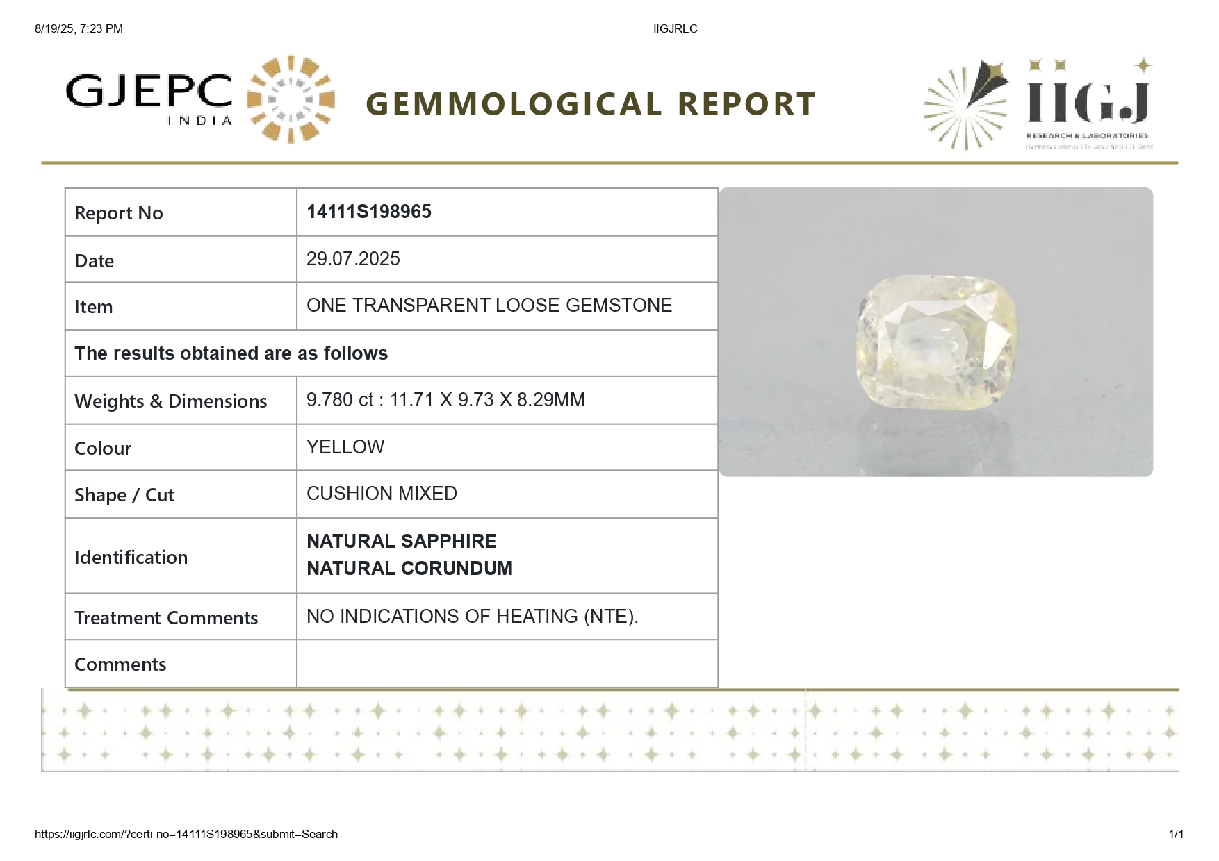 Buy one beautiful transparent 9.78 Carat/ 10.75 Ratti original yellow sapphire stone online . It has a cushion shape, and a clarity grade of eye clean (evaluated at eye level), with good color intensity. The origin of this real yellow sapphire(pukhraj) stone is Ceylon(Sri Lanka). This yellow sapphires is 100% unheated & untreated and certified from IIGJ Govt. Lab.